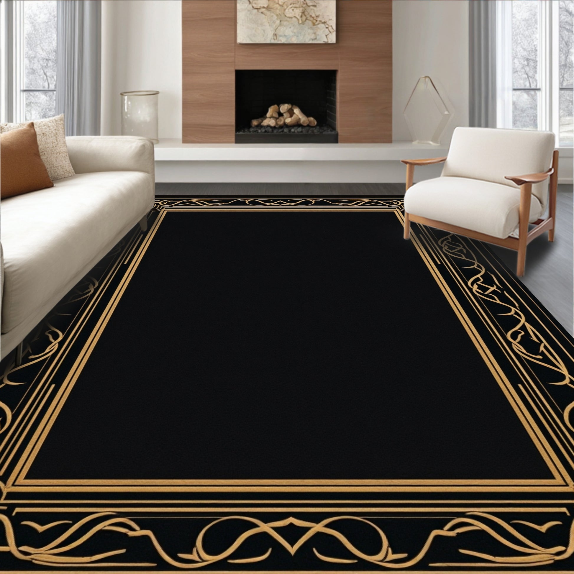 Elegant Black Gold Ornate Rug(Black)